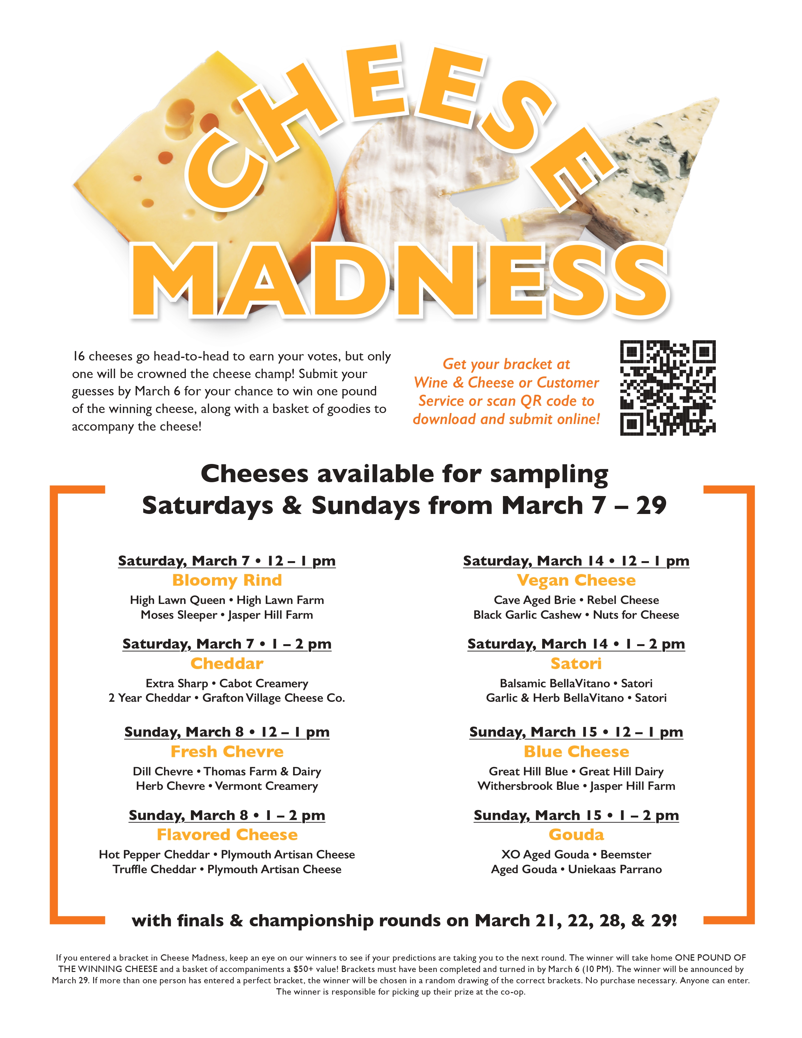 Cheese Madness brackets will be available to fill out and submit online and in our Cheese Shop through March 6th. Players are asked to review the 16 cheeses and guess which one in each of the brackets will be the most popular among co-op shoppers during our cheese tastings in March. Entrants will continue choosing winners for each match-up, progressing through each round (toward the center bracket) until they guess the cheese champ.