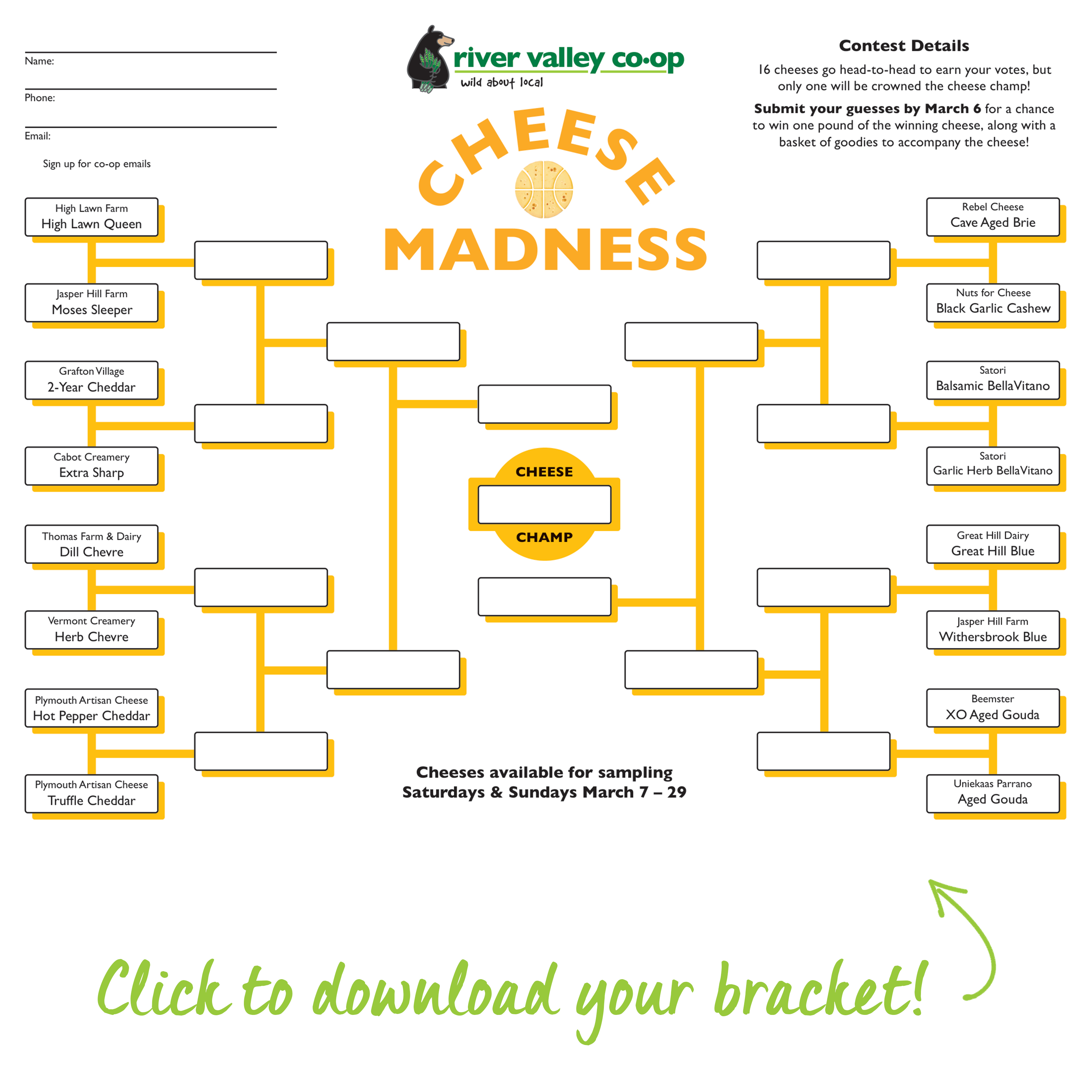 Enter to win by filling out the Cheese Madness bracket above for a chance to win a pound of the winning "cheese champ" cheese + a basket of accompaniments valued at $50+. Fill out and enter your bracket by March 6 at 10 PM at Customer Service, the Cheese Shop, or email it to info@rivervalley.coop.