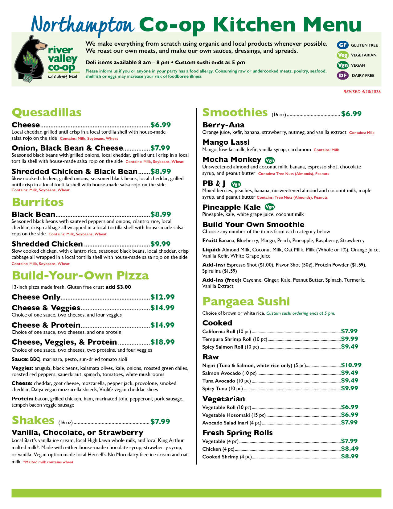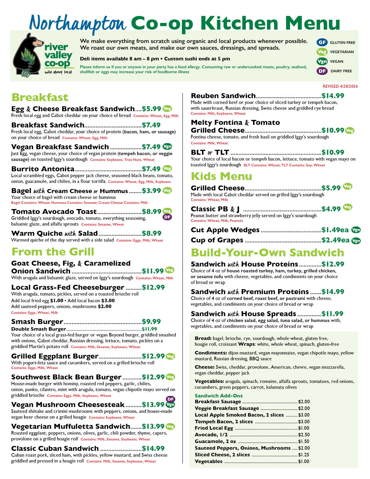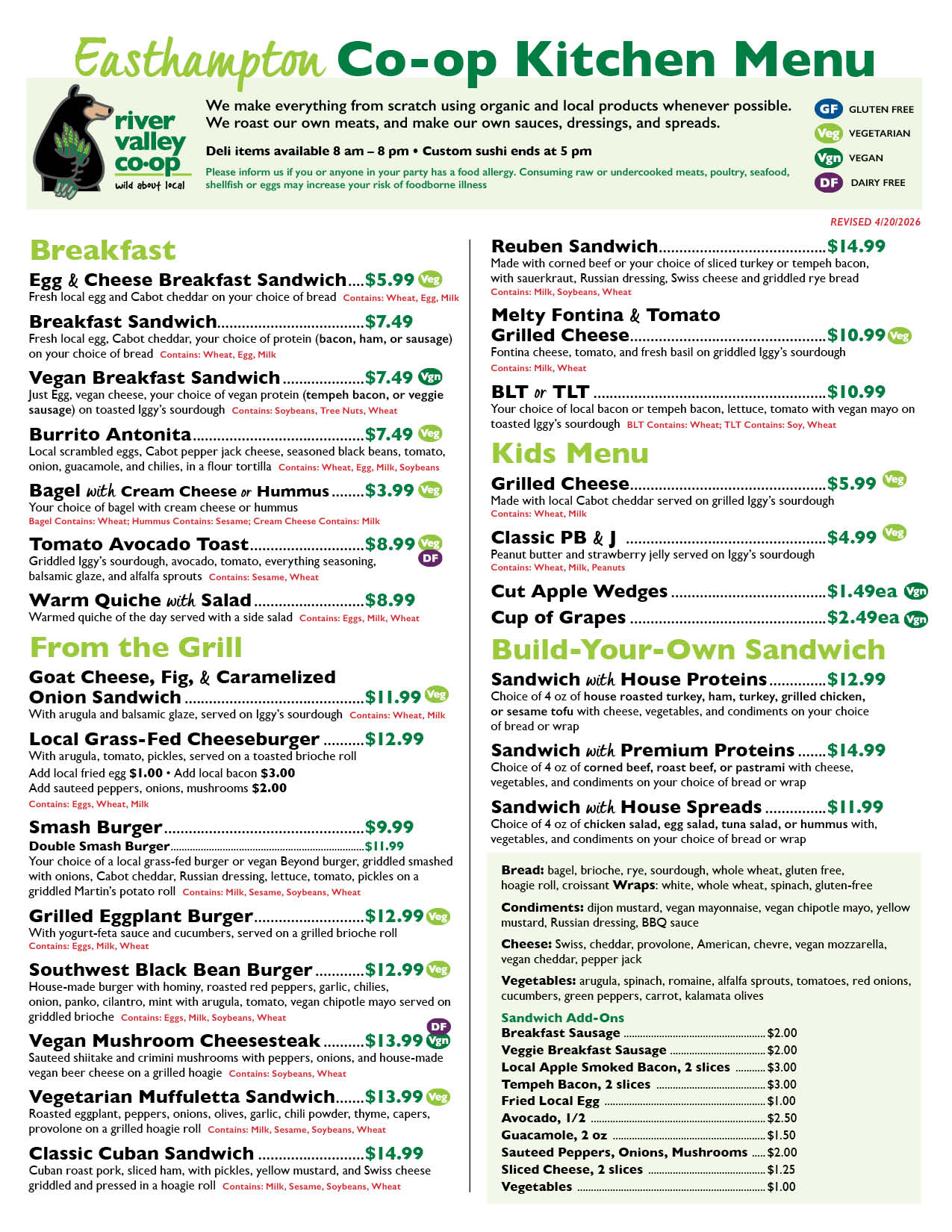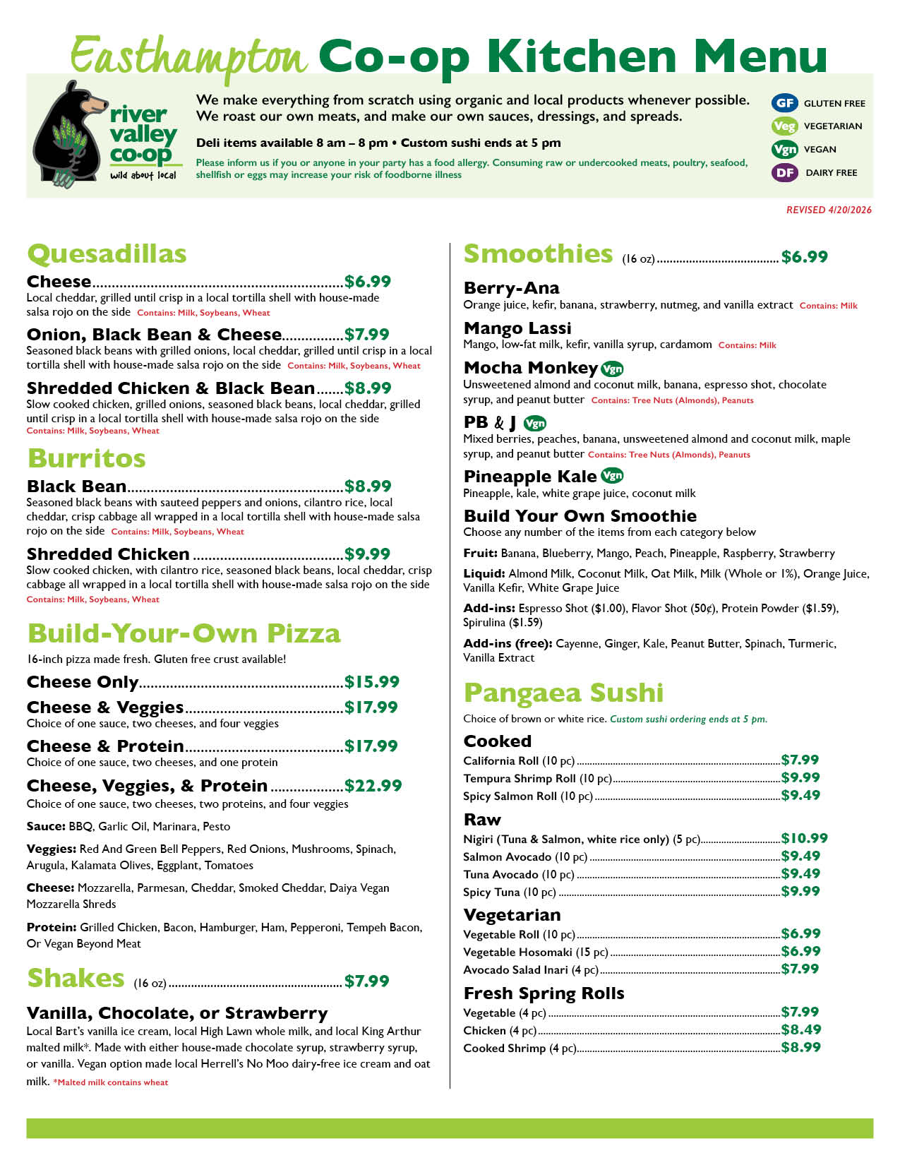 To place a takeout order, simply call the River Valley Co-op location listed on the menu and ask for the Co-op Kitchen! A staff member will take down your order and confirm when it will be ready for pickup.