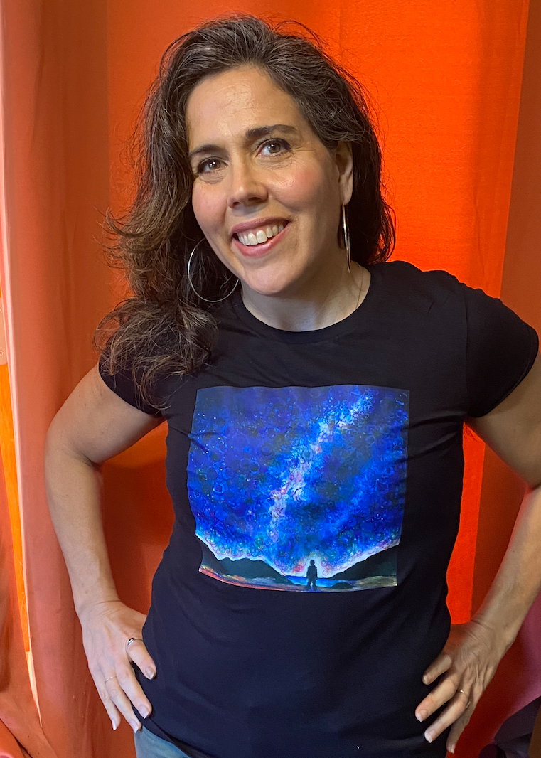 Colorful circle-filled landscapes, vivid abstracts and bright animals and creatures are some of the subjects of my work. I create mixed media originals, shirts with prints of my art and other pieces, and a variety of cards.