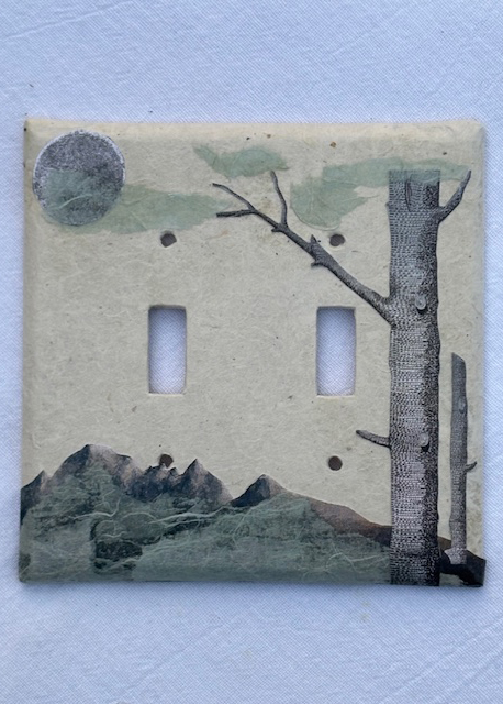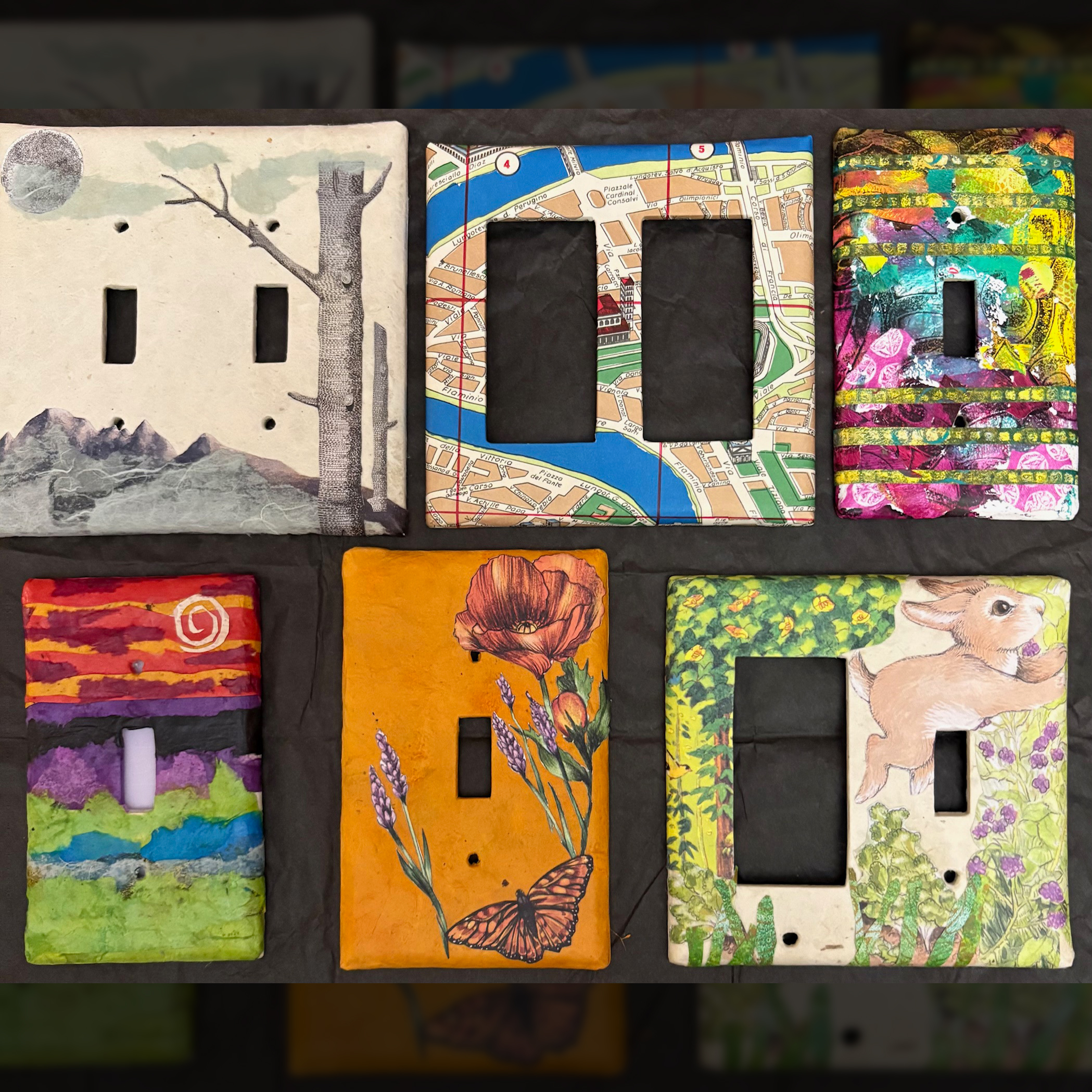 Ruth Ever makes upcycled paper collage light switch covers of all sizes and shapes for all ages and rooms. Covers range from colorful, soothing, and whimsical to geometric. Each is unique. Check your sizes before you come!