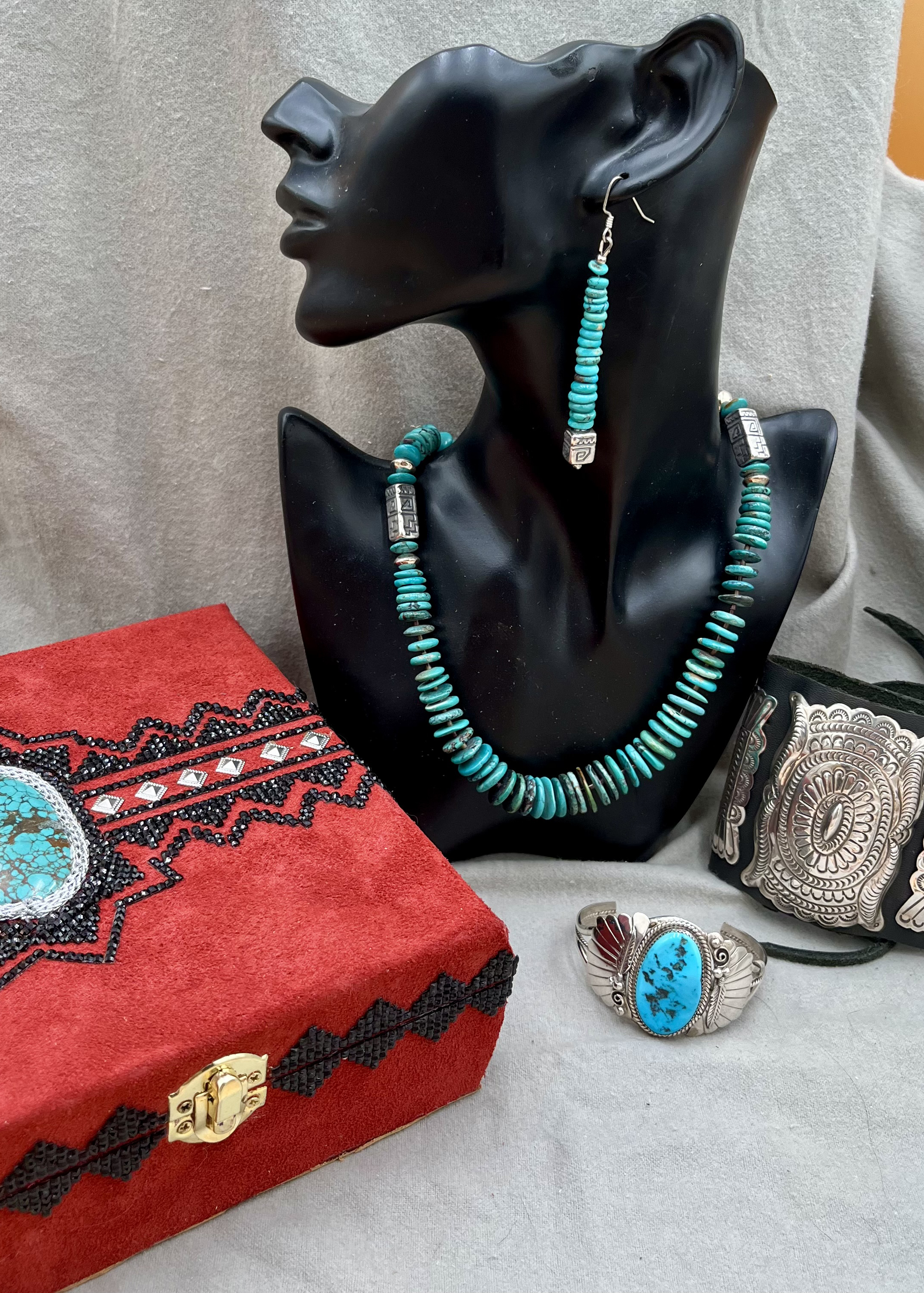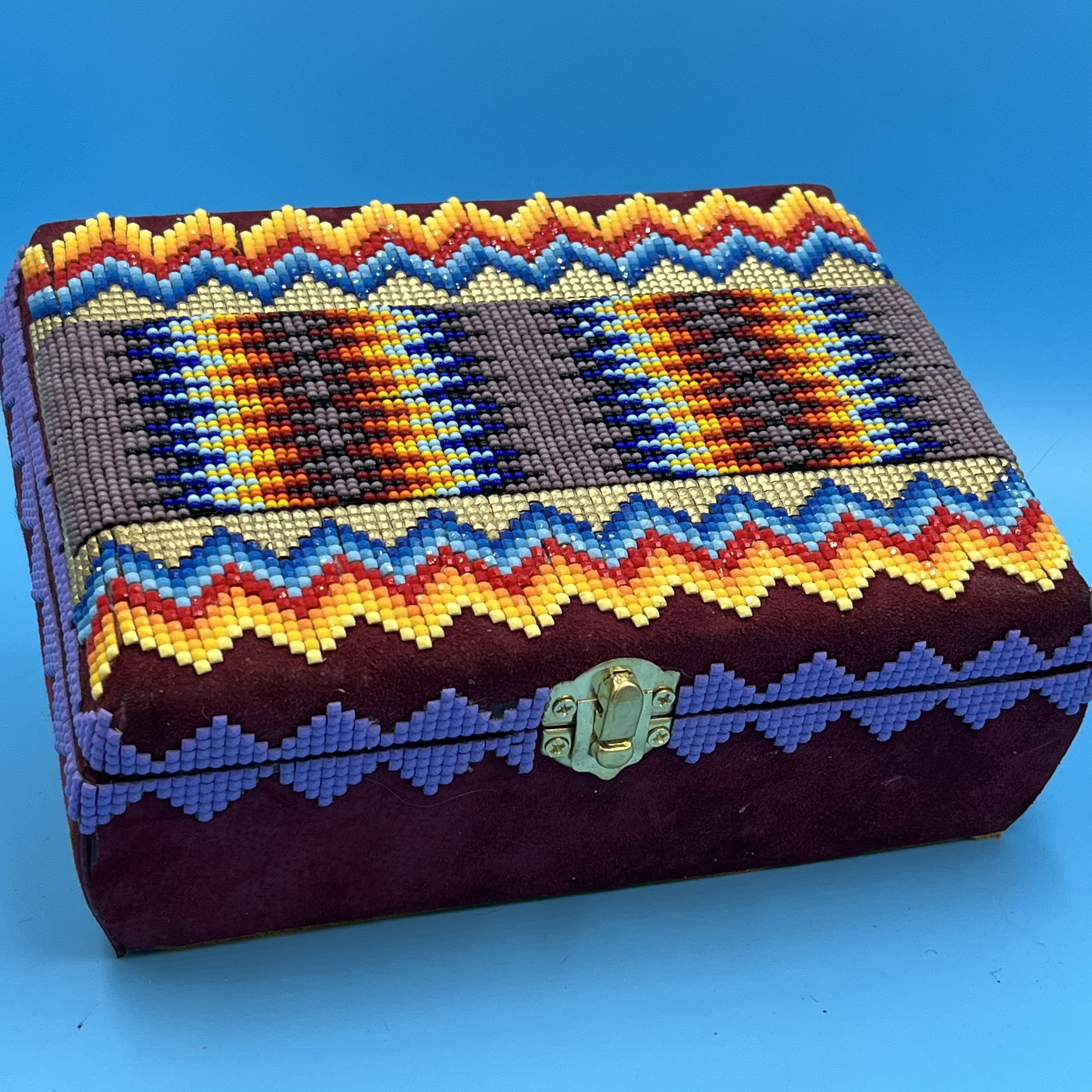 Amalia FourHawks is a Native artist specializing in designs from her Southwestern heritage. She creates beadwork, turquoise jewelry, and beaded leather-covered treasure boxes in a variety of shapes and sizes.