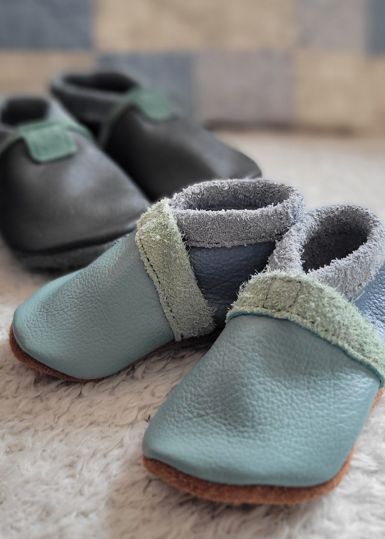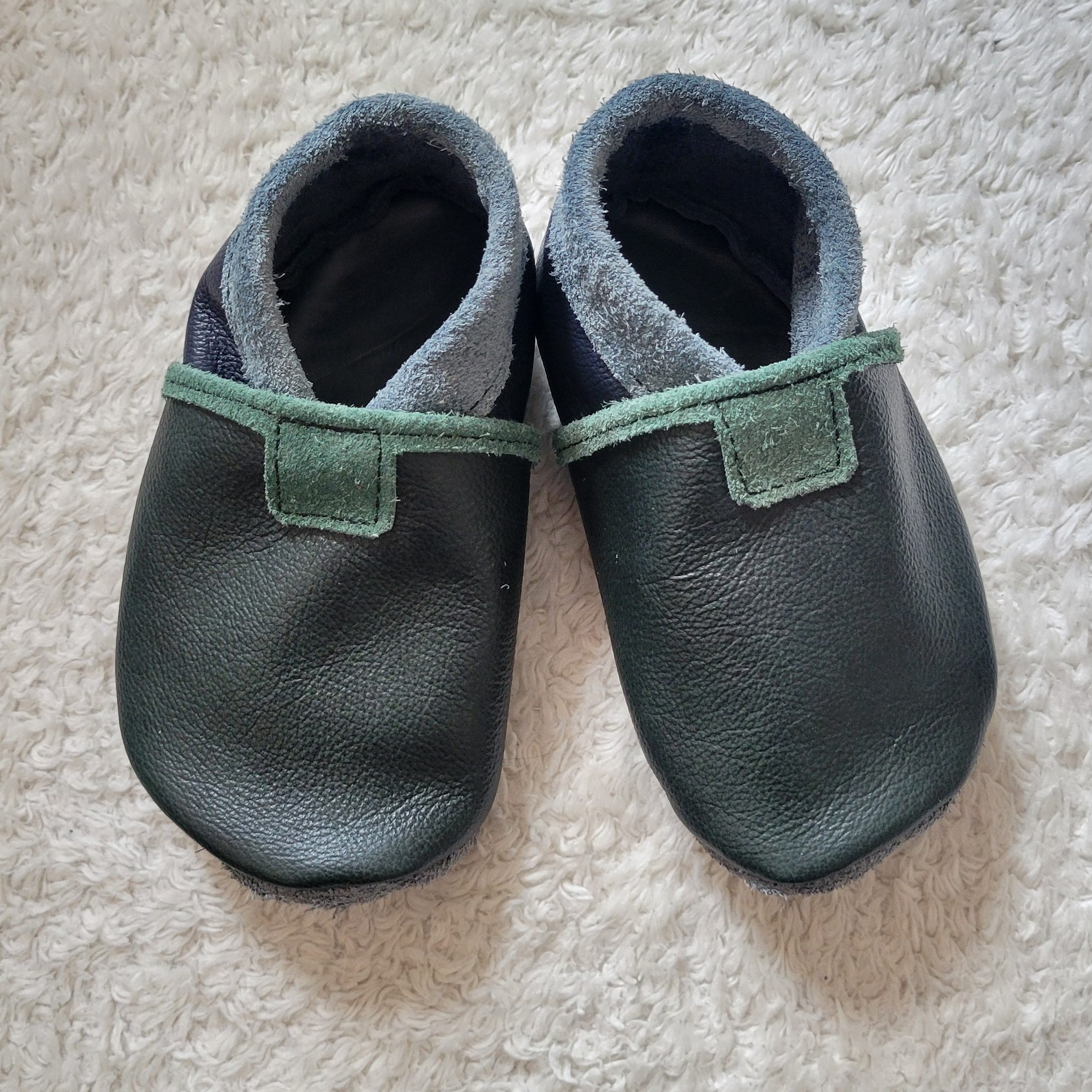 I make soft soled baby and toddler shoes from repurposed leather upholstery samples and bike inner tubes. They leave plenty of space in the toe-box for children's developing feet, and are great for new walkers and active kids!