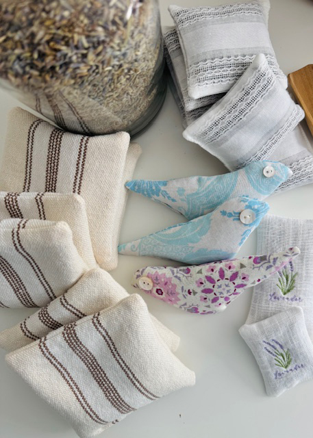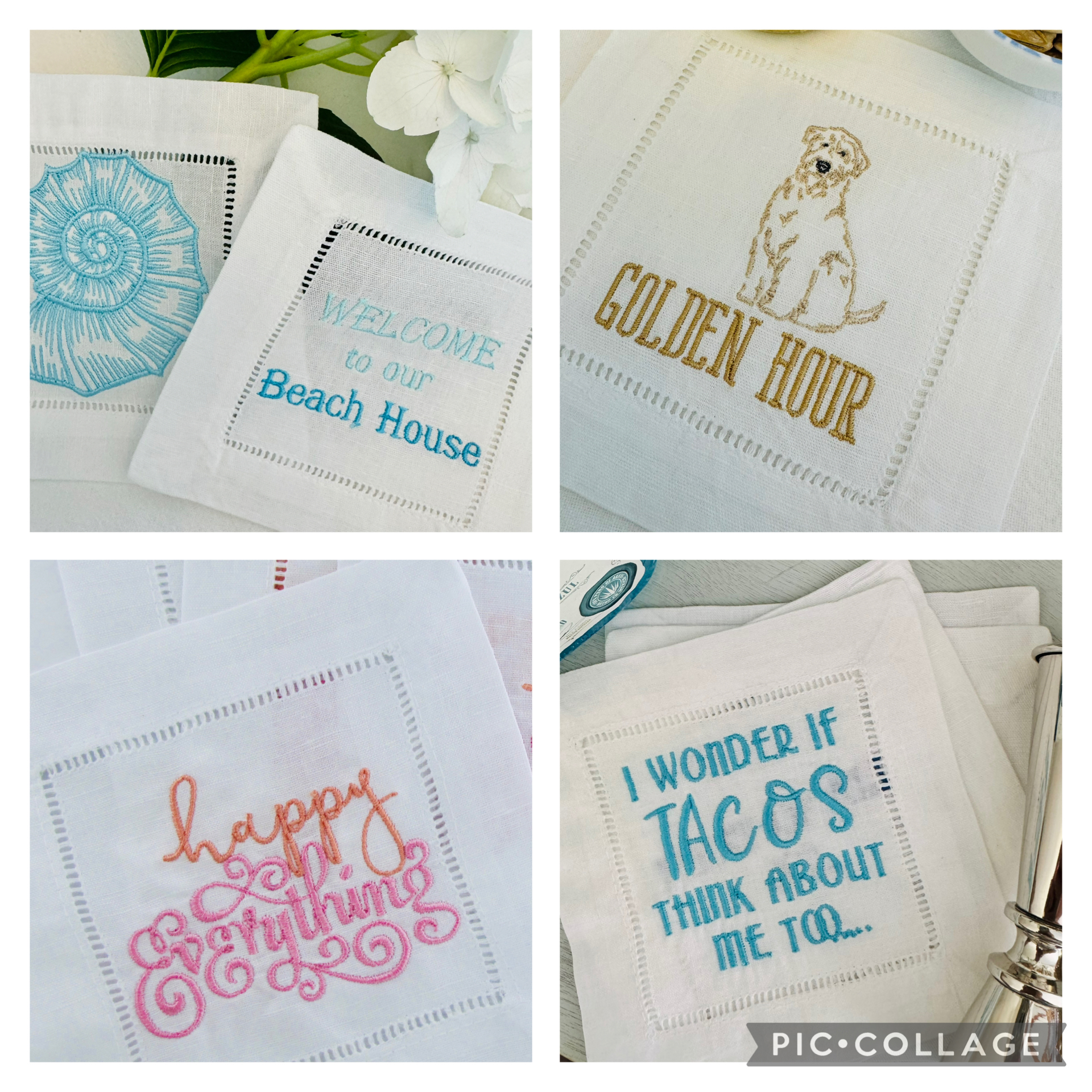 Old Island Stitch makes embroidered cocktail napkins and towels, as well as handmade artist smocks, gardening smocks, and lavender sachets!