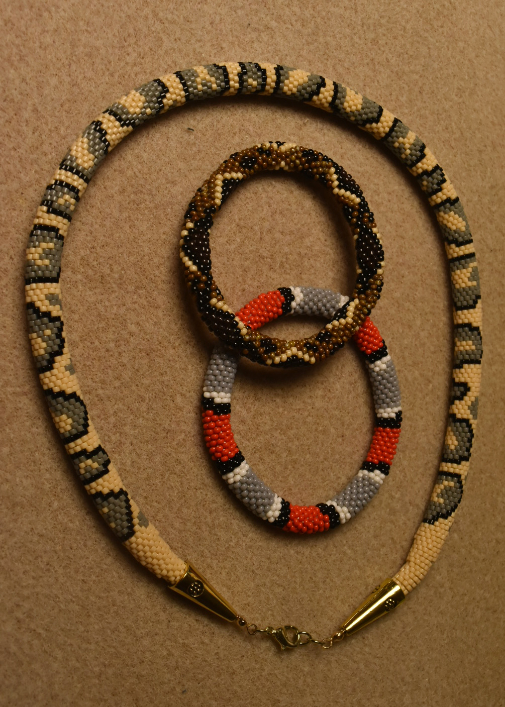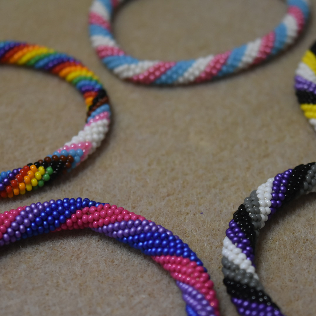 I make bead crochet bracelets and necklaces with a focus on pride colors and snake patterns. Each piece is made using all-natural materials including cotton, glass, metal and stone.