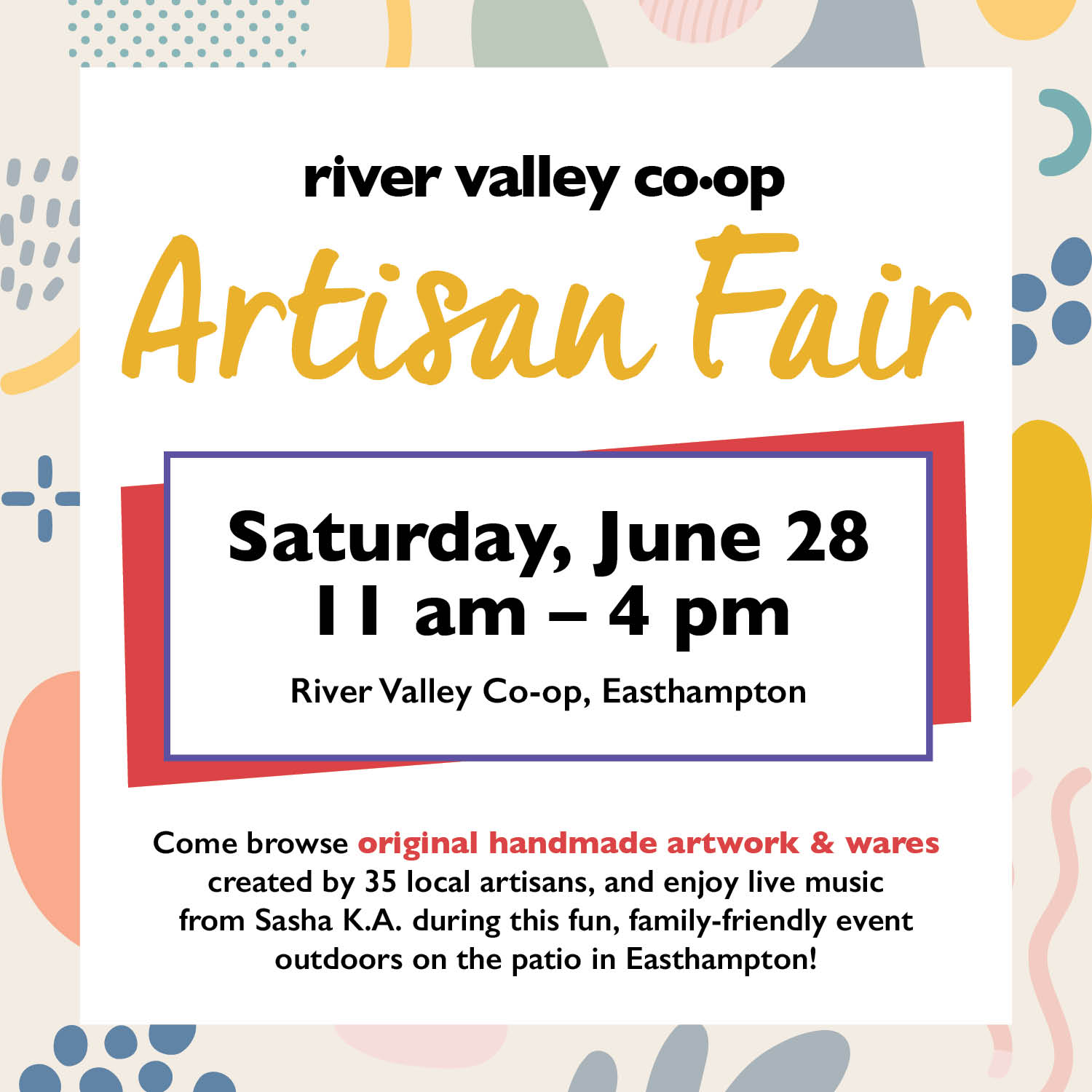 Join us for our second arts and craft fair on Saturday, June 28th from 11am – 4pm outdoors on the patio at River Valley Co-op Easthampton!