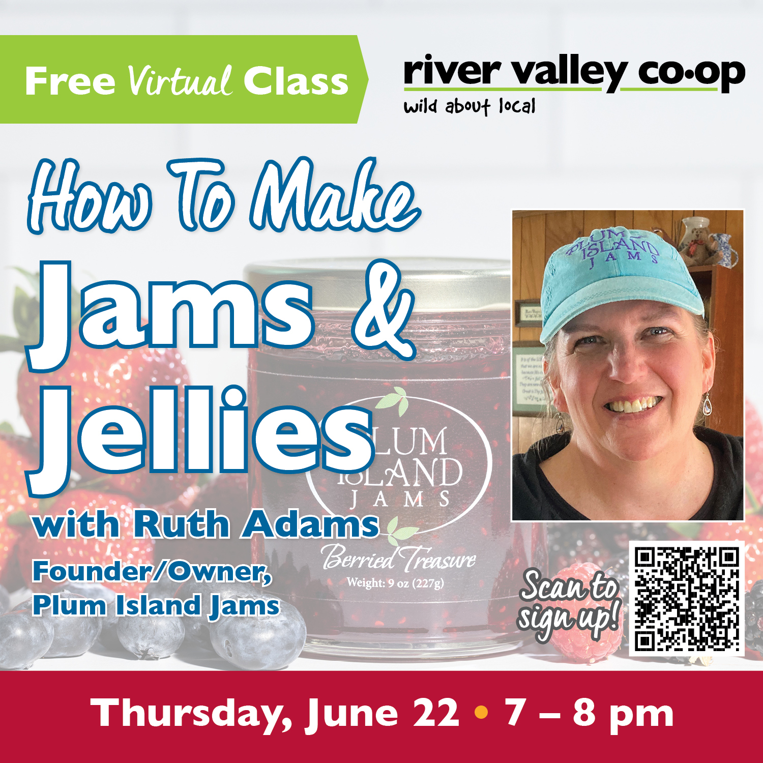 Jam isn’t just for breakfast anymore! Ruth Adams, founder and owner of Plum Island Jams, will demonstrate how to turn fruit into delicious jam and she will have lots of tips and advice for making and preserving your own jams, pitfalls to avoid, different types of pectin or jamming without pectin as well as recipe ideas for cooking with jams. Bring all your questions about jams and jellies!