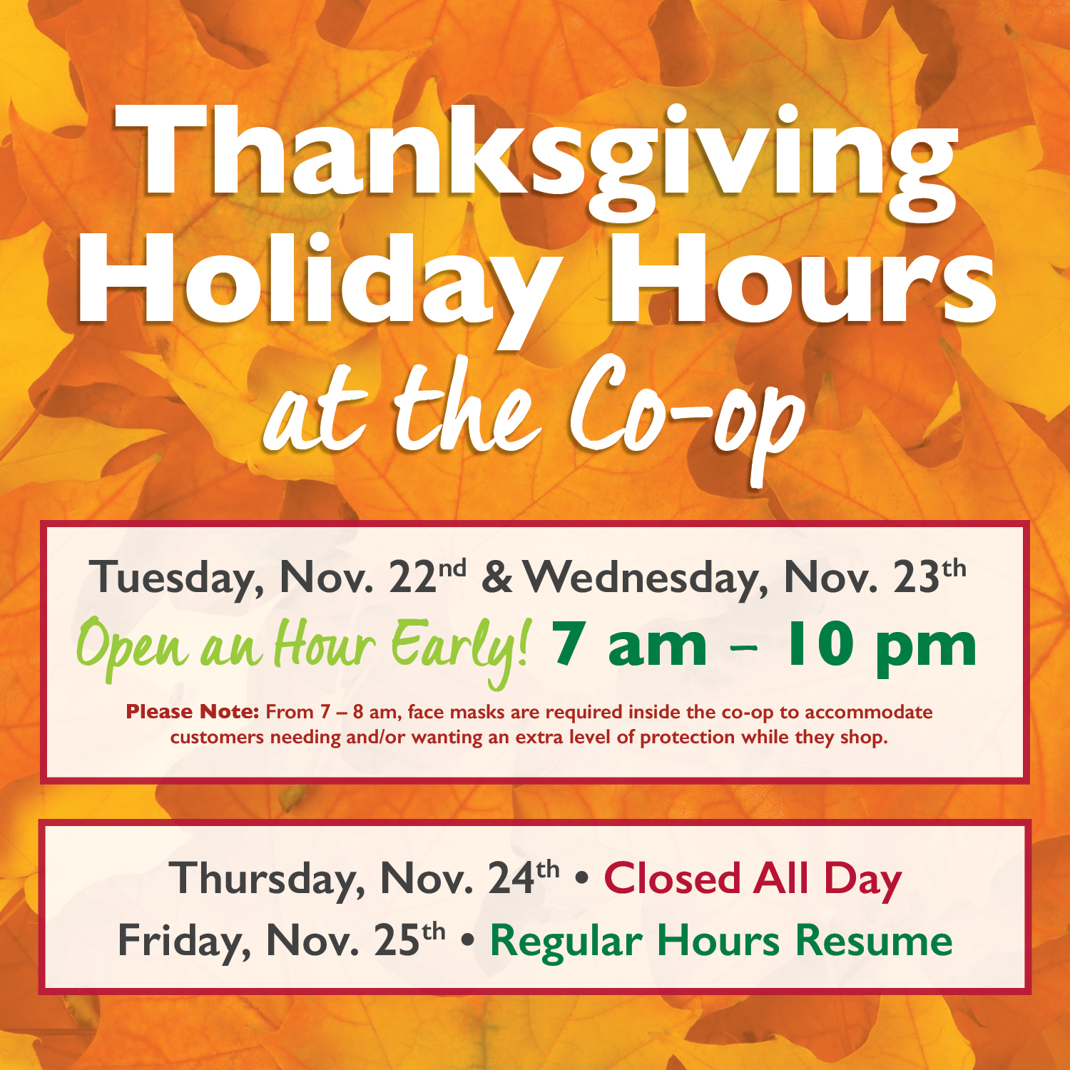The co-op will be closed all day Thanksgiving so that our employees can enjoy the day with their families, friends and loved ones. Regular hours will resume on Friday, November 25th.