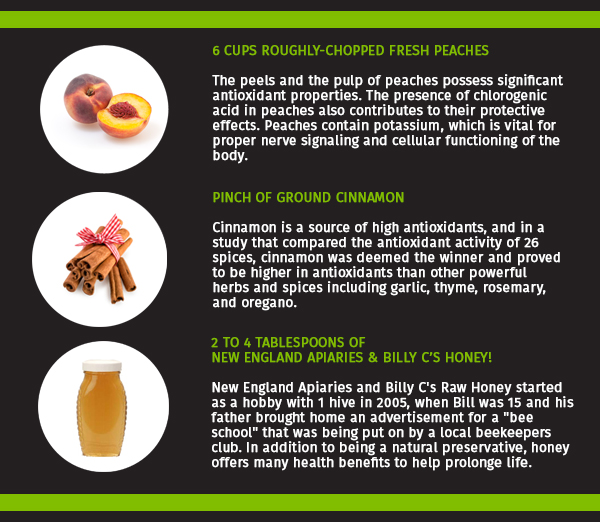 - In a large, heavy-bottom pot, stir together the peaches, spices and honey.